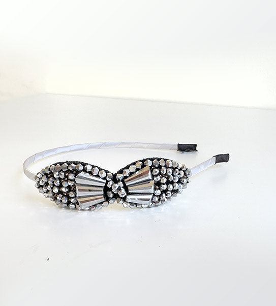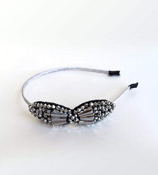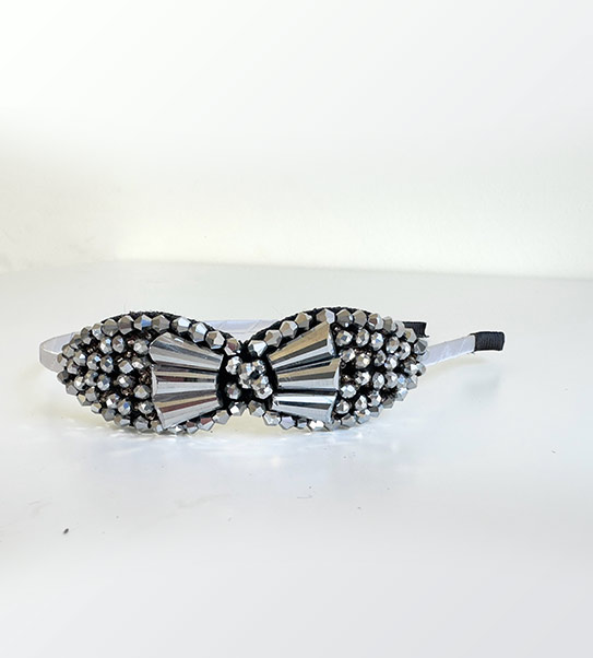 - Trendy headband featuring a lovely bow of black fabric ornamented with metal beads