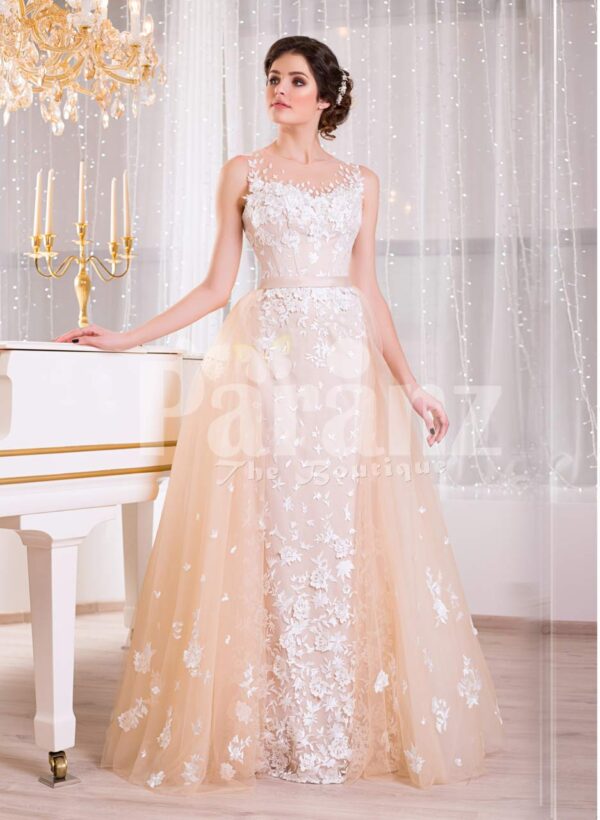 This party season, you will easily get the best quality floor length tulle skirt gown at Paranz. This is a beautiful evening gown with breathable cotton lining inside. The bodice base is of satin and sheer with white lace, rhinestone, and threaded works. On the waistline, there is beige belt to define the shape. After the waistline, there is flared tulle skirt till the ground with floral appliqués.